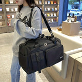 Bolsa weekender com múltiplos bolsos: a bolsa fitness possui 1 compartimento principal grande (com bolso para itens molhados dentro), 1 bolso para sapatos, 1 bolso frontal com zíper, 1 bolso frontal com aba, 1 bolso lateral, 1 bolso traseiro com zíper. O espaçoso compartimento principal oferece espaço suficiente para roupas esportivas, sapatos, chinelos de banho, itens de higiene para viagem, fones de ouvido, garrafa de água e lanche.