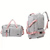 A bolsa para sapatos também pode ser usada como compartimento para roupas sujas. Possui bolsa extra para roupas de banho molhadas, roupas sujas, toalha, itens secos como escova/cuidado capilar, etc. O bolso com zíper na parte de trás da bolsa esportiva também serve como alça para manter a bolsa firmemente presa à mala.