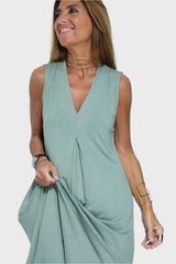 Mostre sua elegância natural com este vestido sem mangas em um tom verde terroso. Perfeito para aparições do dia a dia, bem como para passeios mais casuais com amigos.