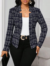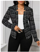 Eleve seu estilo de roupas externas com o Ellie™ - Blazer Xadrez Chic, uma mistura atemporal de elegância clássica e charme moderno. Projetado com um sofisticado padrão xadrez e confeccionado em tecido de poliéster tecido de alta qualidade, esta jaqueta estilosa é perfeita para todas as estações. O fechamento frontal com zíper adiciona um toque contemporâneo, enquanto os delicados babados nos ombros e punhos trazem um charme feminino.